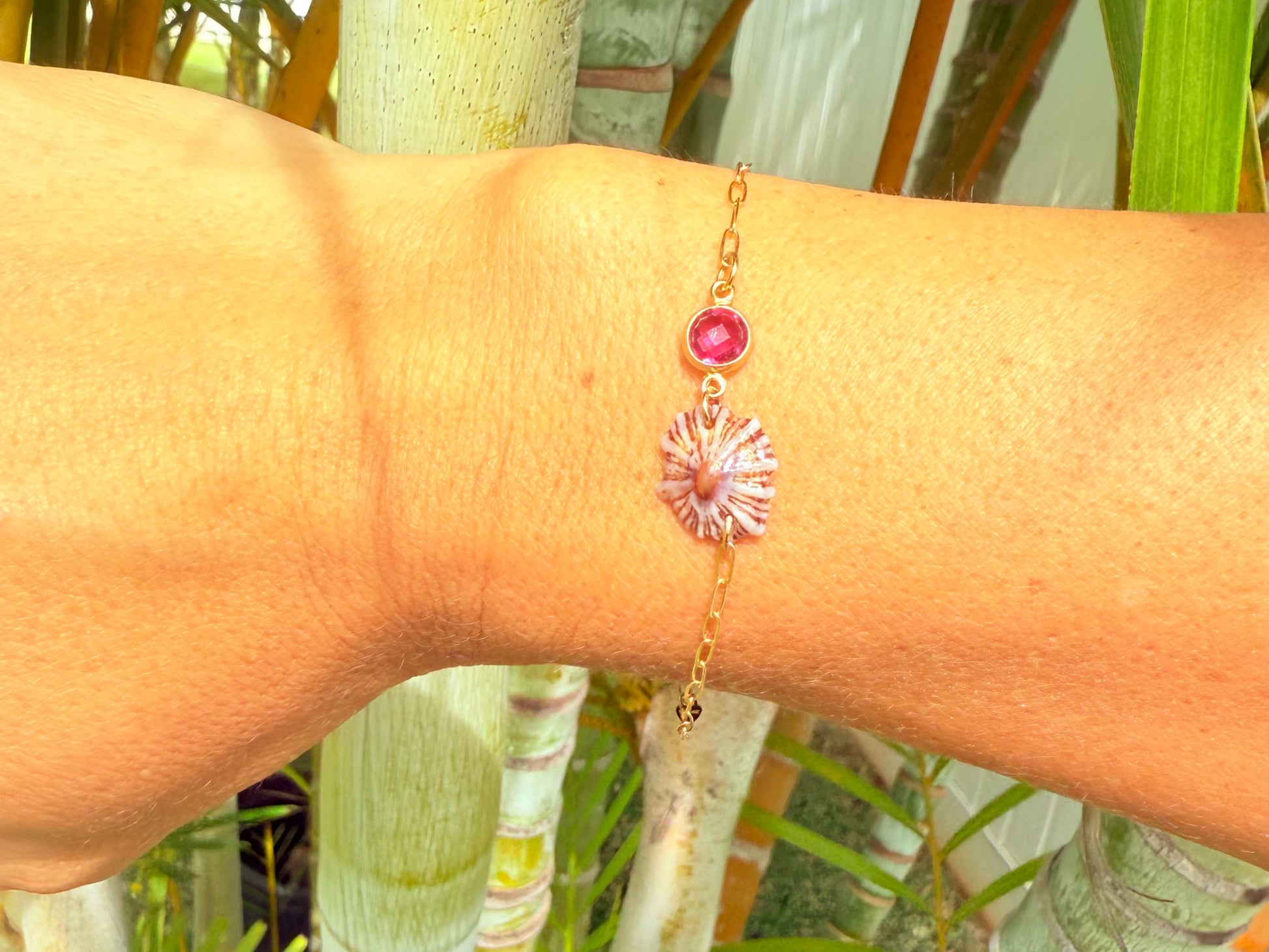 Gold-filled chain with an Opihi ‘awa shell set next to a gem. Each piece is one of a kind...shells are hand picked along the beaches of Oahu and unique in color. Shells have a thin coat of resin for added protection.
